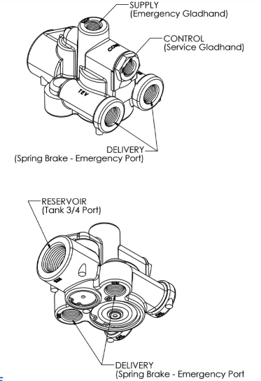 Trailer Emergency Valve, 1/4" Supply And Control Ports, (4) 3/8" Delivery Ports, 3/4" Reservoir Port, Spring Brake Priority